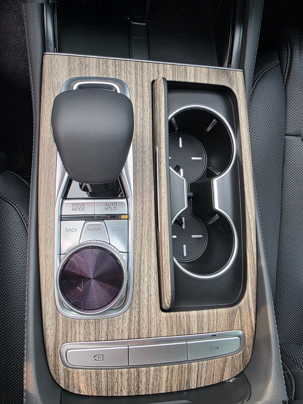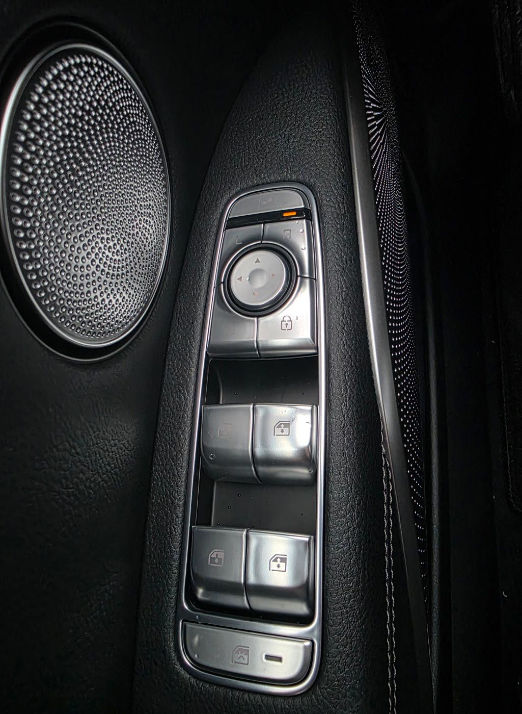 운전석 문쪽에는 도어락 버튼과 키즈락 버튼이 있습니다. 기어변속기는 레버형식의 기어노브입니다. 변속기 노브 아래에는 내비게이션 조작컨트롤러가 있습니다.